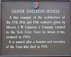 Restored 17th and 18th century house.Extensively rebuilt in the early 18th century by Charles Redman (a Lord Mayor) and split into two in the mid-18th century the house was given to the York Civic Trust and restored in 1969 when it was divided into flats. ![]() Wall plaque. Photo: taken 4 June 2007. |