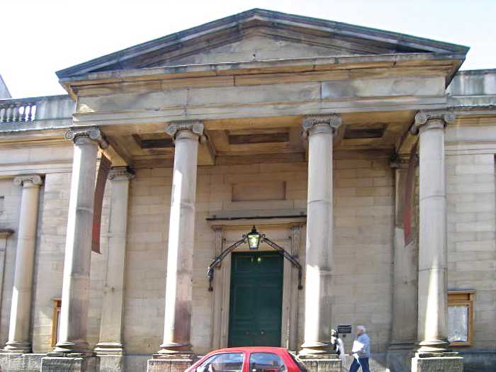 The portico on the Assembly Rooms.In the original design of 1731 the steps into the building were placed in a semicircle outside the main entrance. These steps were moved into the building in 1791 and the current porticoed facade was built in 1828. Well used for the first 20 years of its life, the building has seen mixed fortunes since. It was purchased by the City of York in 1925 and was fully restored in 1951. The building was purchased from the city of York by the York Conservation Trust in 2002 and it is currently used as a restaurant, but is still open for public viewing. Photo: taken 5 April 2006. |