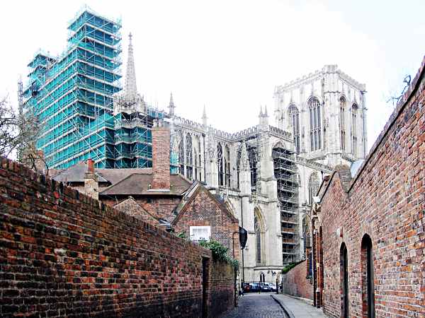 The Choir and Central Tower of the Minster.Built in the last half of the 14th century, the choir is the last major addition to the final cathedral, replacing a Norman choir built in the second half of the 12th century. Repair work to the fabric of the Minster is ongoing, and at this time, as can be seen here, involved the whole east end. Photo: taken 18 March 2006. |