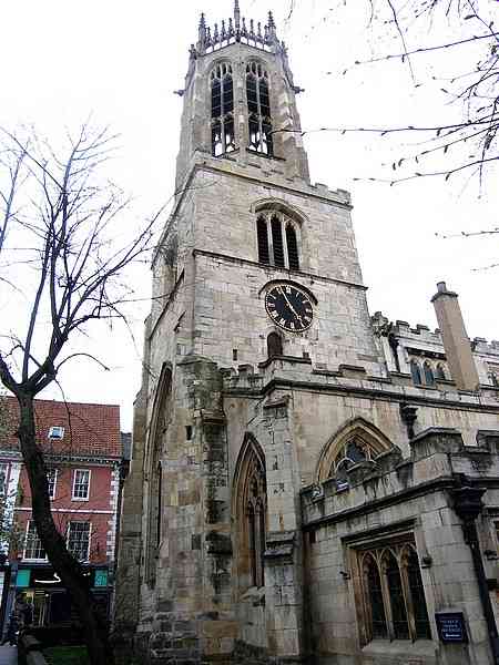 Lantern Tower, All Saints Pavement.A church on this location was mentioned in the Domesday book of 1087, though the oldest parts of the current building date from the 12th century. The tower was built in the early 15th century and was partially rebuilt in 1837, with the lantern tower above it being completely rebuilt at that time. The light in the lantern tower was possibly there originally to guide travellers through the Forest of Galtres to the north and north east of the City. (The 'Forest' comprised much open land rather than being a forest as the term is now used.) Now the lantern is lit as a memorial to the citizens of York who died during the two World Wars. Photo: taken 24 April 2006 |