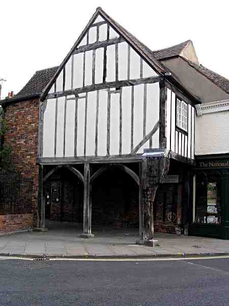 Site of one of four Minster precinct gatewaysThe current structure was built about 1600 using older timbers. Until 1903 when Deangate was created, this was the only way through from Goodramgate into College Street. It was once the site also of a bridge over Goodramgate to Bedern (from about 1400) which allowed the Vicars Choral to walk to the Minster without leaving the precinct. (Ref. 2) Photo: taken Sunday morning, 29 April 2007. |