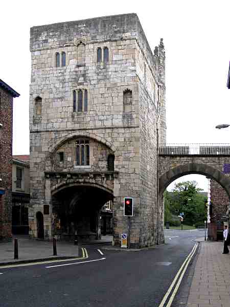 The city side view of Monk BarThe 14th century Monk Bar is the tallest of the bars in York's walls. The entrance to the wall walk anticlockwise to Bootham Bar is the dark doorway on the left in the tower. If you have time only to walk one stretch of the Bar Walls, this is the stretch to walk. Photo: taken Sunday morning, 29 April 2007. |