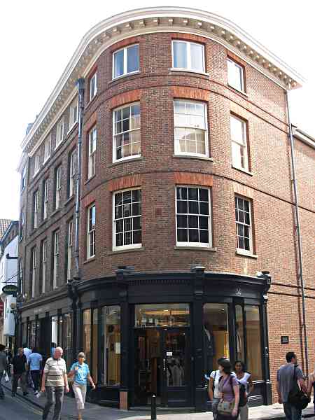 Number 59 (end unit) was demolished in 1963 and a modern unit with a curved front into Grape Lane has been built to match the original units left facing Petergate. (Ref. 1)