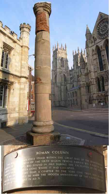 Roman column found underneath the Minster whilst structural repairs were being carried out. Contrary to what anyone might say, the column is not upside down! The plaque reads: This Roman column once stood within the Great Hall of the Headquarters building of the Fortress of the Sixth Legion (whose emblem was a bull) in the fourth century. It was found in 1969 during the excavation of the South Transept of the Minster. Lying where it had collapsed. It was given by the Dean & Chapter to the York Civic Trust, who in 1971 erected it on this site to mark the 1900th Anniversary of the foundation of the City by the Romans in 71.