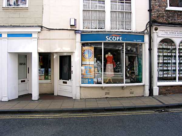 One of two Scope charity shops in York, the other is at 57a Goodramgate. Number 11 Colliergate was built about 1600 as a timber-framed house of two stories. Rebuilt with brick and extended to three stories in the 18th century. Website:Scope UK. Photo Copyright Dave Woodcock 2008. |
