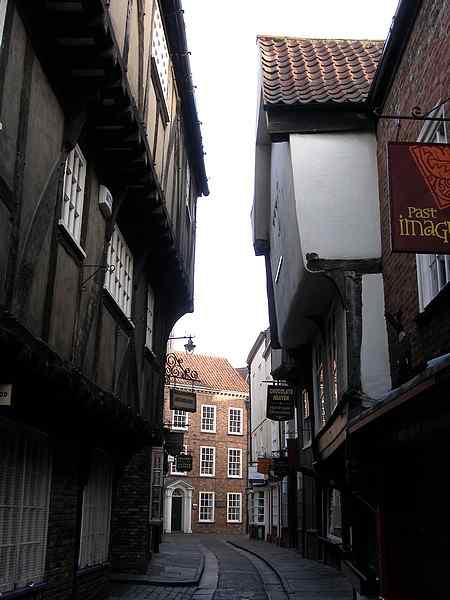 The jettied houses at this point in the narrow street lean far enough over to allow persons on opposite sides of the street to shake hands.