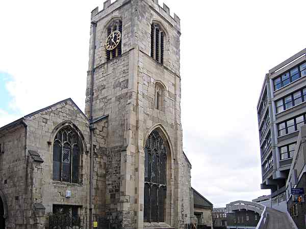 15th and 19th centuries.The church was probably founded before the conquest on a site that was reclaimed from a marsh (it overlooks Hungate which itself has been reclaimed from the marsh originally associated with the River Foss). It was rebuilt in the 15th century and again, most of it, in the 19th. The tower and north west corner in this view are from the 15th century. It is now used by the York Archaeological Society. (Ref. 1) Photo: taken 18 March 2006 |