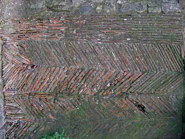 Between the infirmary undercroft and the Multangular Tower the standing wall is Roman. This is a segment of that wall, low down and near the infirmary.
