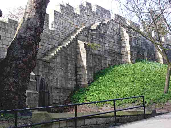 Rising steeply from the river.The Roman fortress walls were sited above the river bank. This is a short section of the medieval walls between the river at Lendal Tower and the Roman wall adapted as the medieval boundary. It is part of a stretch of wall between the river and Bootham Bar which is not accessible to the public. Photo: taken 16 April 2006 |